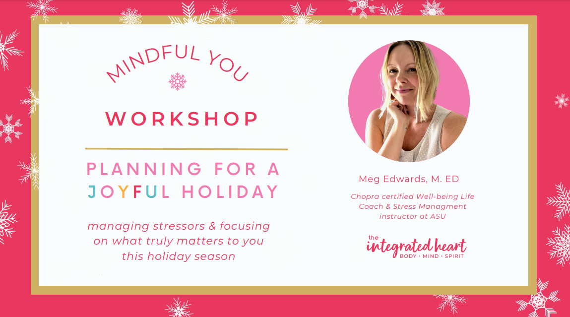 This 2-hour workshop is designed for you to learn how to calm your nervous system with breathwork and simple mindfulness tools. You’ll explore your holiday priorities and your self-care musts, so you can let go of the external clutter and focus on what truly makes this season the most joyful to you.